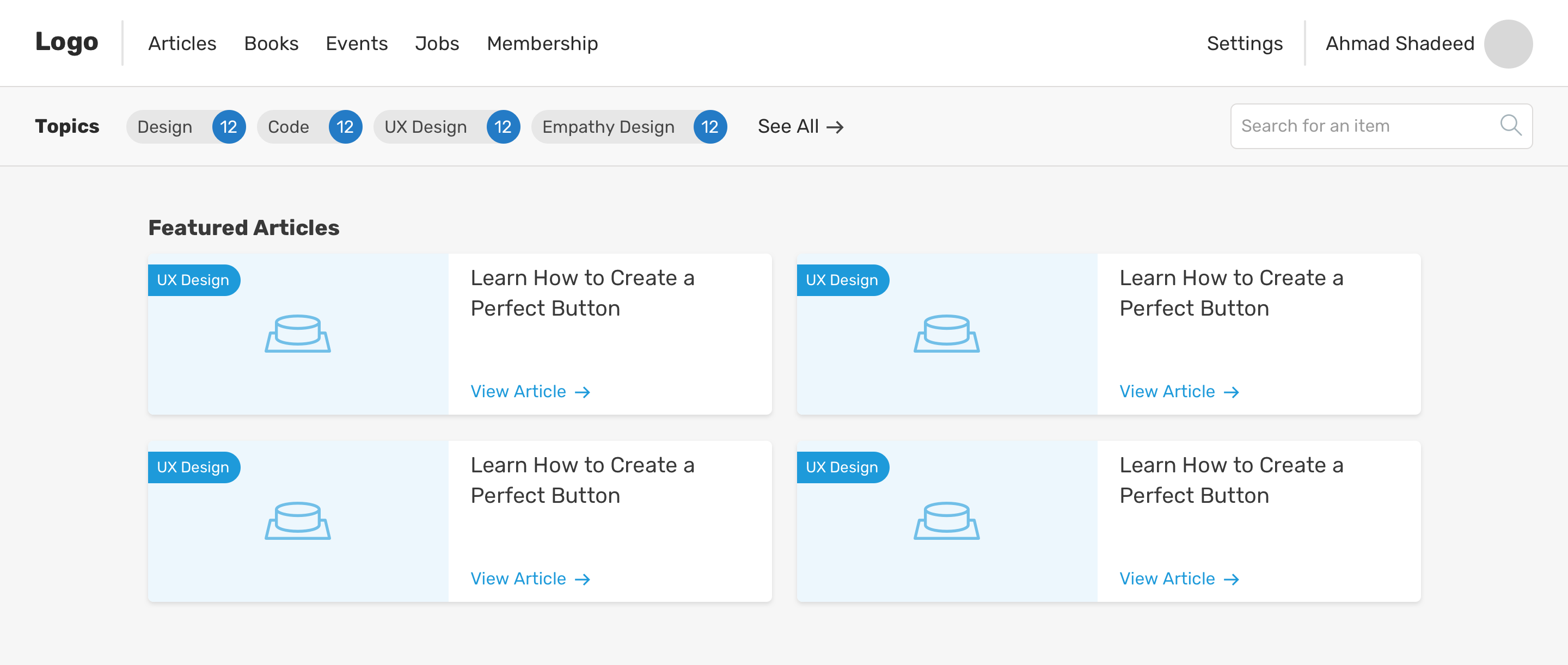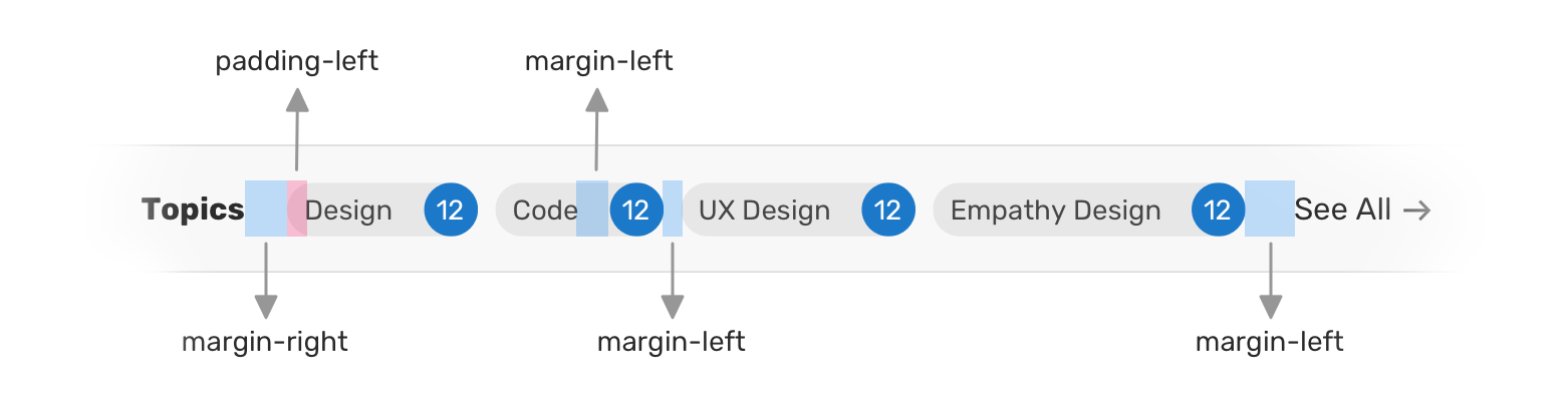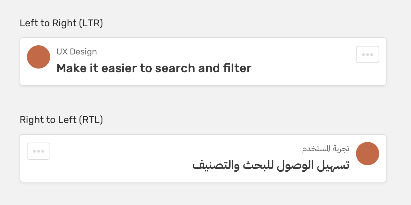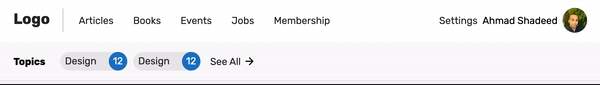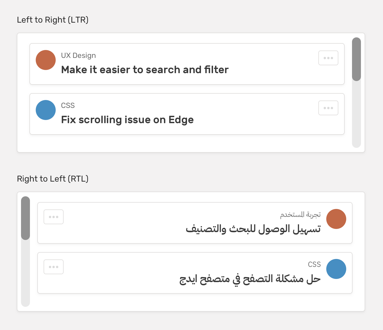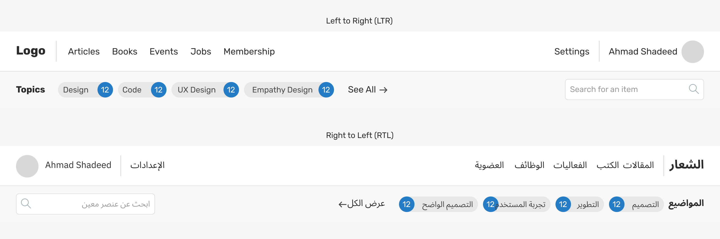 Next, I’ll work on the topics component (the one in the subheader with labels and counters). Here is a design mockup of how the topics component should look in LTR and RTL. Notice that the placement of the counters is different.