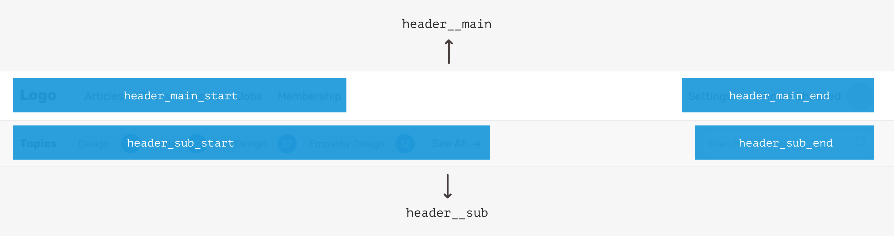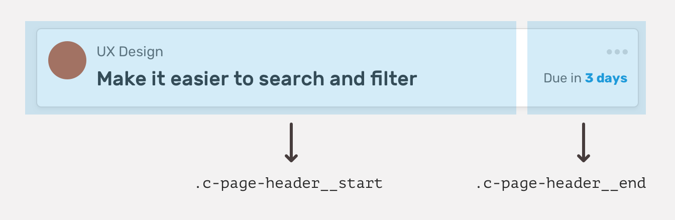 Instead of giving the elements presentational names, like .c-page-header__left and .c-page-header__right, I’ve named them .c-page-header__start and .c-page-header__end. This is more future-proof and doesn’t assume that the website is only LTR or only RTL.