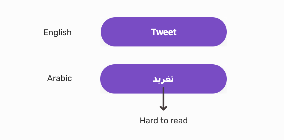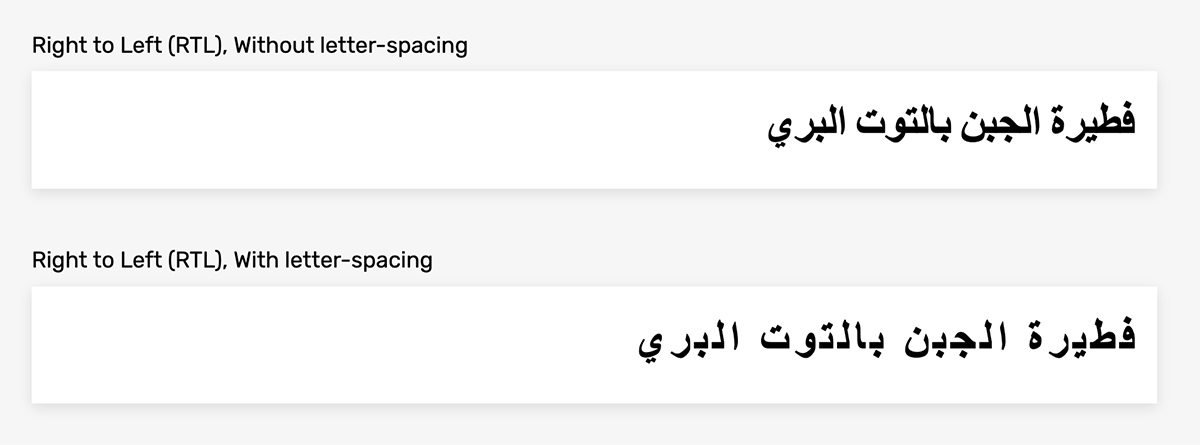 Notice that in the content with letter-spacing, each word’s letters look disconnected from each other. That’s not right. Arabic letters are supposed to look connected, and keeping the English letter-spacing works against that. Make sure to set letter-spacing: 0 when working on a multilingual layout.