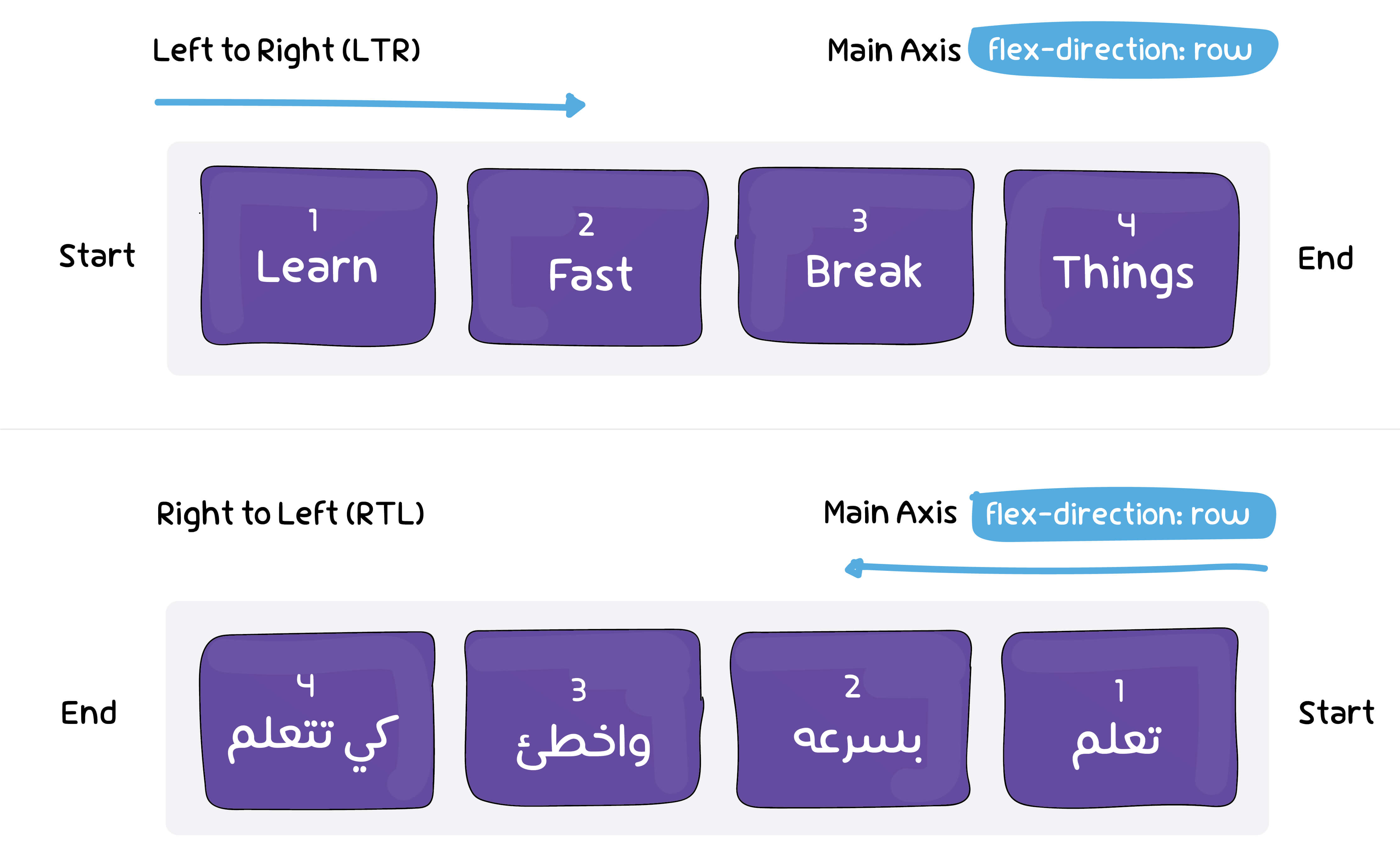 When the page’s direction is changed to RTL, flexbox will flip its items accordingly. That’s a huge benefit! The illustration below shows how the flexbox axis is flipped based on the direction.