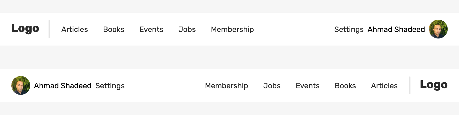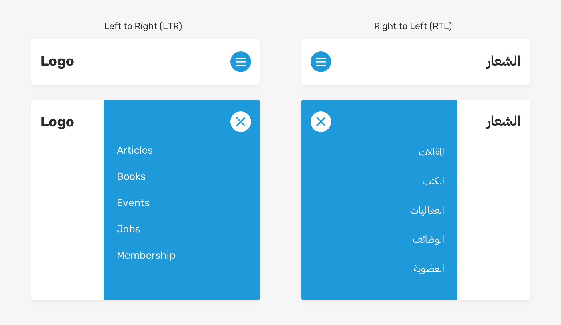 Next is the mobile menu. I will use a hamburger icon to indicate the menu. The placement of the icon will change between LTR and RTL. The same goes for the direction of the translate animation.