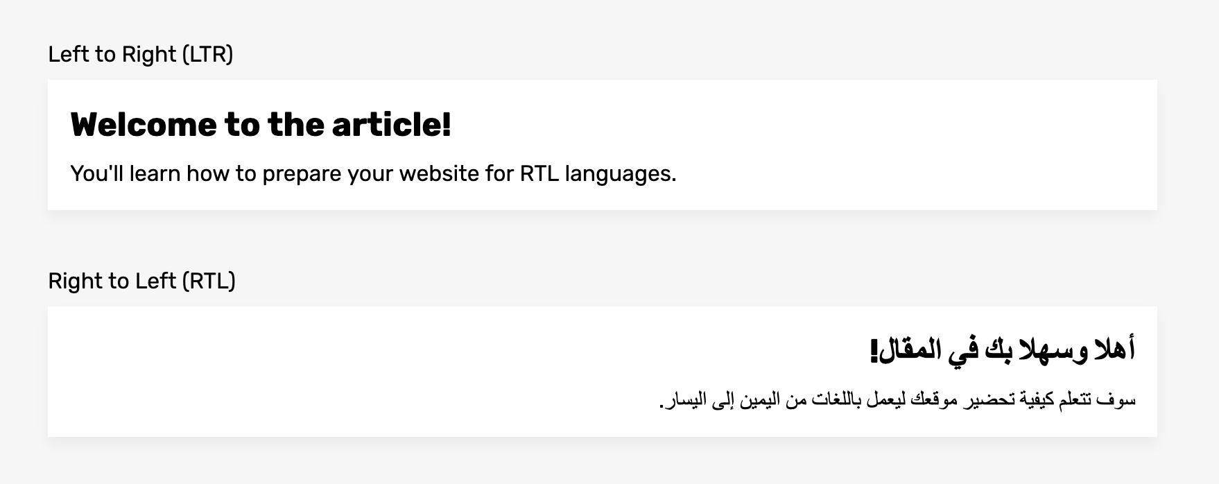 Notice for the RTL section, the text reads from right to left, which is the opposite of the LTR text. Luckily, the browser did all of the work for this simple example. To switch a document’s language direction, you will need to add the dir attribute to the root element.