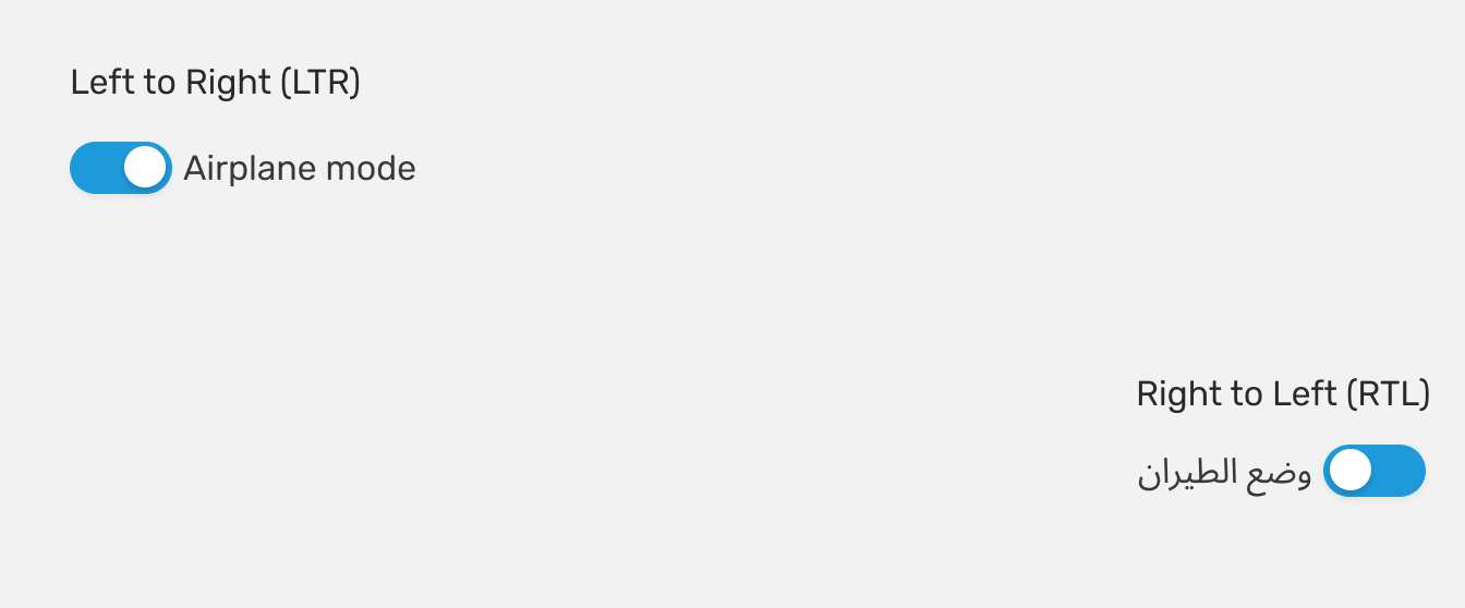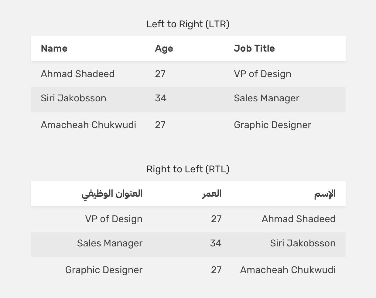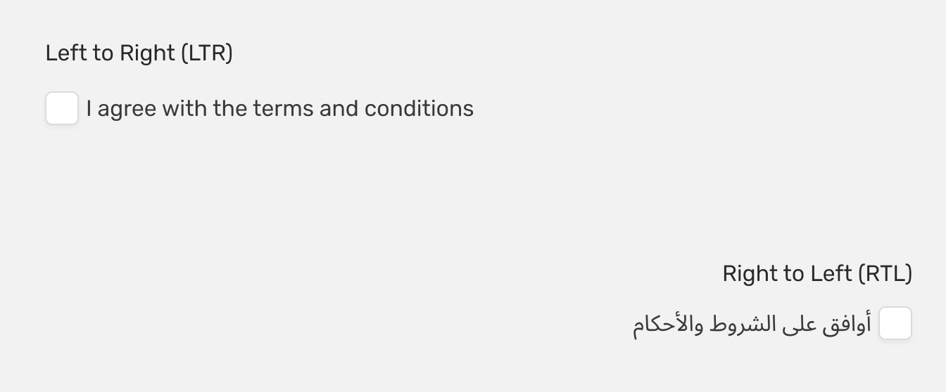 In addition to setting the dir=rtl attribute on the HTML element, we may also add direction: rtl as a CSS style.