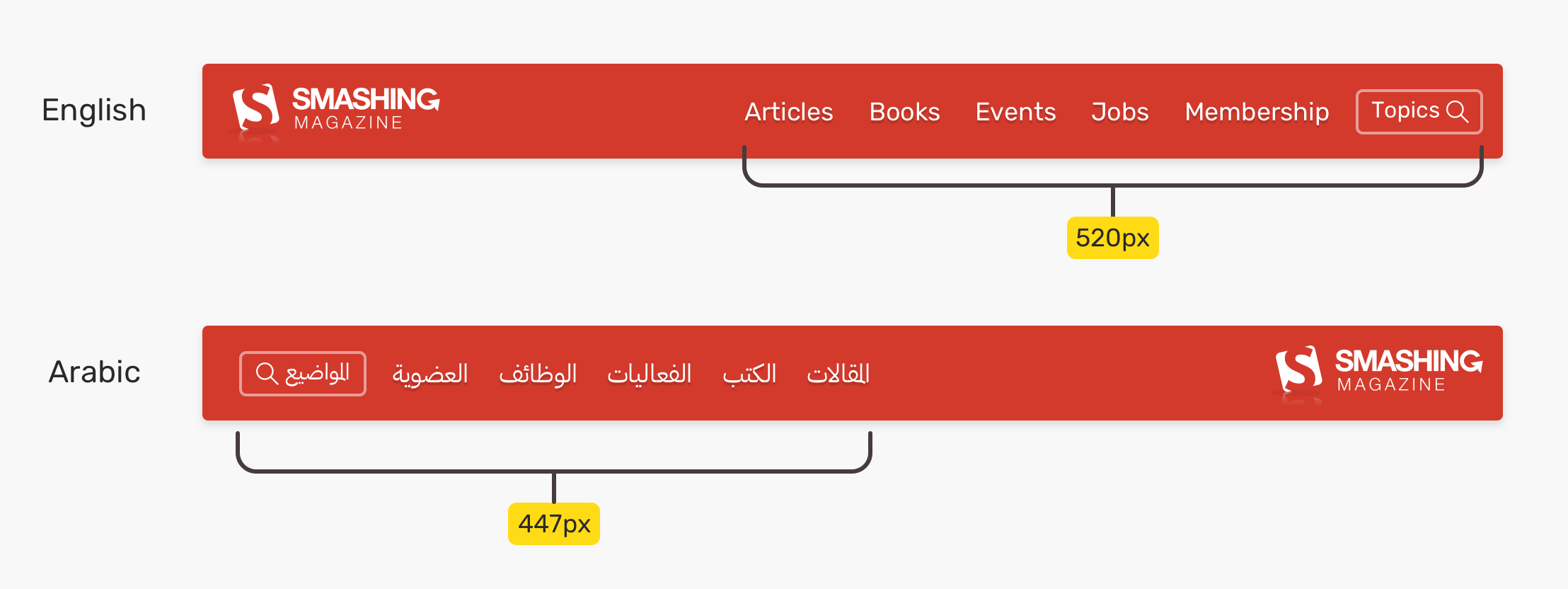 Sometimes, when a website is translated into Arabic, the sizing of elements changes due to some words becoming bigger or smaller after translation. Consider the following example, in which I’ve mocked up the navigation of Smashing Magazine’s website.